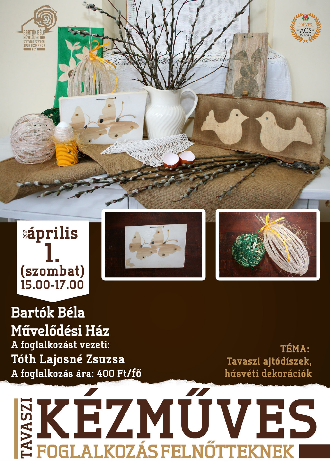 Április elsején várjuk ezúttal a felnőtteket a művelődési házba, ahol a tavaly már nagy sikert aratott rendezvényünk hangulatát szeretnénk megidézni. A felnőtteknek szóló kézműves foglalkozás keretében ezúttal tavaszi ajtódíszeket és húsvéti dekorációkat készítünk. Várjuk az érdeklődőket nagy szeretettel. Részletek a plakáton!
