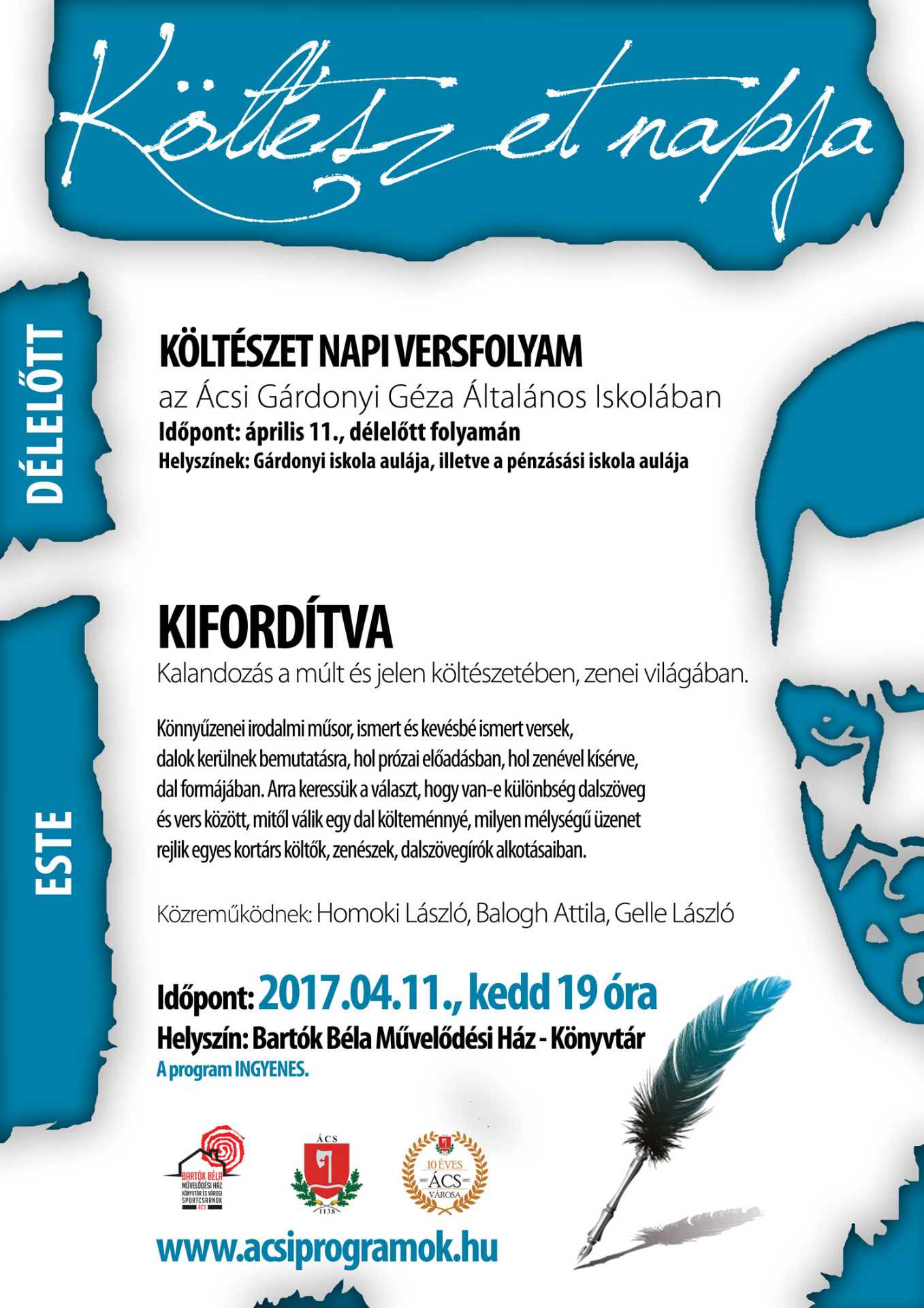 Április 11-én minden verskedvelőt várunk szeretettel a Költészet napi programunkra. Délelőtt a Gárdonyi iskola diákjai is bekapcsolódnak a rendezvénysorozatba, költészet napi versfolyamot tartanak mindkét iskolában a délelőtt folyamán.